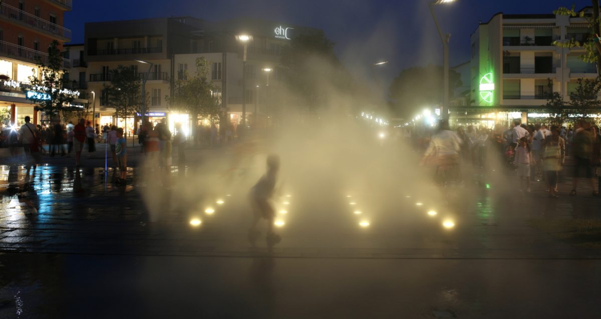 Piazza Adidas: two opposite lines of laminar jets create a water tunnel that people can walk through.